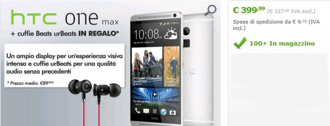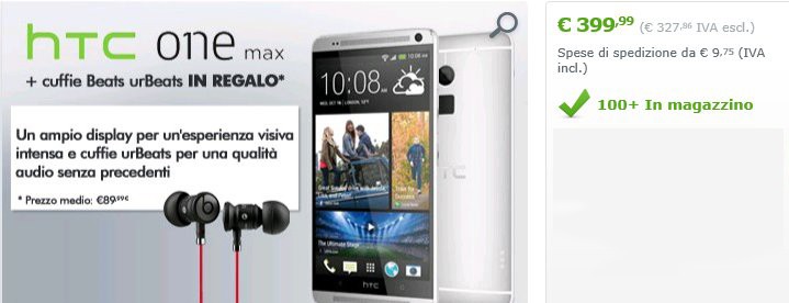 HTC One max, il phablet del produttore taiwanese, diventa protagonista di un'interessante offerta attivata da Expansys. Il noto store offre la possibilità di acquistare HTC One max al prezzo di 399 euro, comprendendo nel prezzo un paio di cuffie in-ear urBeats (prezzo di listino 99 euro, reperibili in rete a cifre prossime agli 80 euro).